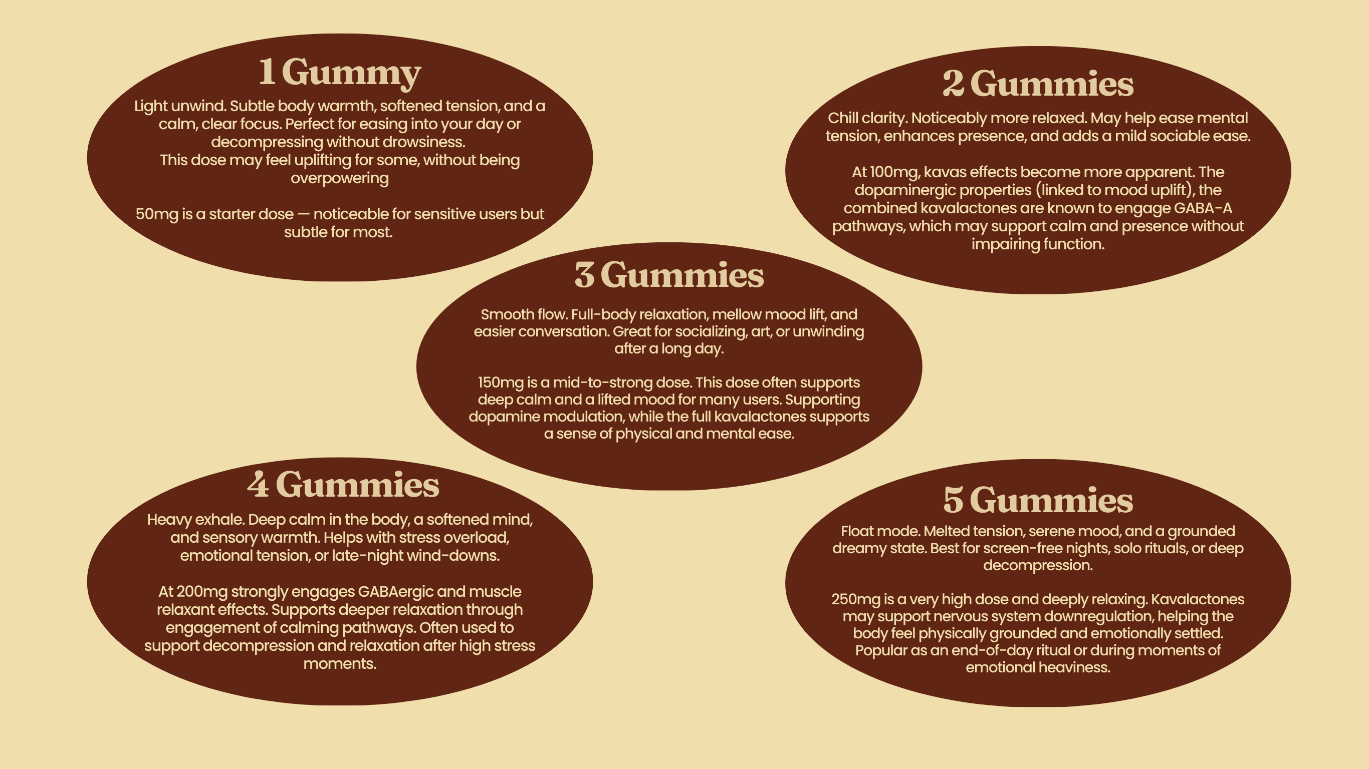Your first time: Kava works a little differently than most supplements. It has a reverse tolerance, meaning some people feel it right away, while others may need a few sessions to uild up the effect. We suggest starting with 1-2 gummies and easing into your ideal dose over time.